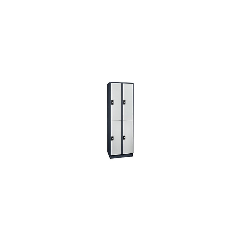 Armadietto guardaroba, 4 scomparti, larghezza 600 mm, grigio antracite / grigio chiaro. Fornitura = montato. Altezza = 1800 mm. Profondità = 500 mm. Larghezza = 600 mm. Colore corpo = grigio antracite RAL 7016. Colore porta = grigio chiaro RAL 7035. Serratura = serratura a cilindro di sicurezza differenziata. Numero scomparti in larghezza = 2 pz. Numero scomparti = 4 pz. Larghezza scomparti = 300 mm. Materiale = lamiera d'acciaio. Altezza armadietto = 1800 mm. Dotazione interna = 1 asta appendiabiti, 3 ganci. Larghezza interna = 298 mm. Altezza interna = 820 mm. Profondità interna = 475 mm. Tipo di porta = frontalini lisci. Numero chiavi = 2 pz. Altezza scomparti = 820 mm. Larghezza ripiani = 300 mm. Profondità ripiani = 500 mm. Altezza zoccolo = 100 mm. Struttura = saldata. Superficie = con verniciatura a forno. Scomparti interni senza bordi per una facile pulizia. Aerazione mediante fori sulla parete posteriore. Fermi in gomma per una battuta ante silenziosa. Resistente struttura in