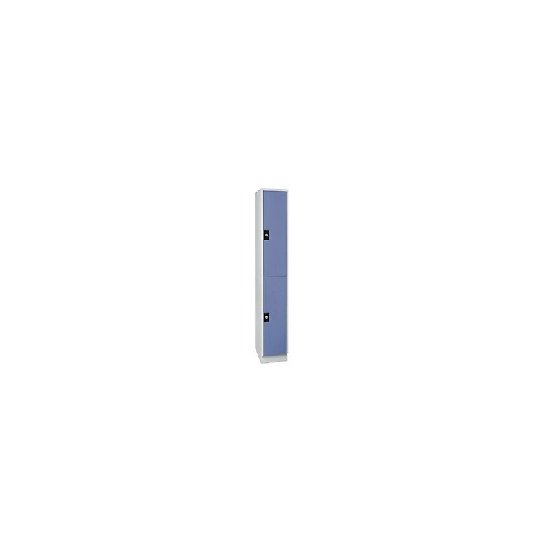 Armadietto guardaroba, 2 scomparti, larghezza 300 mm, grigio chiaro / blu colomba. Fornitura = montato. Altezza = 1800 mm. Profondità = 500 mm. Larghezza = 300 mm. Colore corpo = grigio chiaro RAL 7035. Colore porta = blu colomba RAL 5014. Serratura = serratura a cilindro di sicurezza differenziata. Numero scomparti in larghezza = 1 pz. Numero scomparti = 2 pz. Larghezza scomparti = 300 mm. Materiale = lamiera d'acciaio. Altezza armadietto = 1800 mm. Dotazione interna = 1 asta appendiabiti, 3 ganci. Larghezza interna = 298 mm. Altezza interna = 820 mm. Profondità interna = 475 mm. Tipo di porta = frontalini lisci. Numero chiavi = 2 pz. Altezza scomparti = 820 mm. Larghezza ripiani = 300 mm. Profondità ripiani = 500 mm. Altezza zoccolo = 100 mm. Struttura = saldata. Superficie = con verniciatura a forno. Scomparti interni senza bordi per una facile pulizia. Aerazione mediante fori sulla parete posteriore. Fermi in gomma per una battuta ante silenziosa. Resistente struttura in lamiera