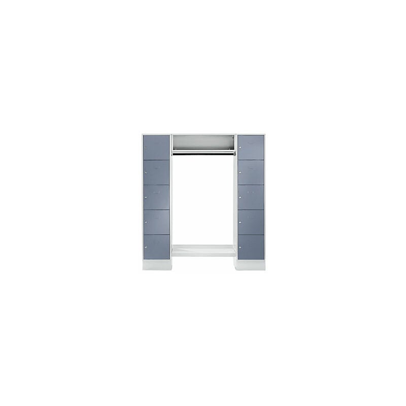 Sistema di strutture guardaroba con armadietti, 10 scomparti esterni, 10 grucce, larghezza totale 1670 mm, larghezza scomparti 398 mm, grigio argento/grigio chiaro. Fornitura = in parte smontato. Altezza = 1850 mm. Profondità = 500 mm. Larghezza = 1670 mm. Colore corpo = grigio chiaro RAL 7035. Colore porta = grigio argento RAL 7001. Serratura = serratura a cilindro differenziata. Numero scomparti in larghezza = 2 pz. Numero scomparti = 10 pz. Larghezza scomparti = 400 mm. Materiale = lamiera d'acciaio, con verniciatura a forno. Altezza armadietto = 1850 mm. Dotazione interna = senza dotazione interna. Larghezza interna = 398 mm. Altezza interna = 345 mm. Profondità interna = 475 mm. Tipo di porta = ante piene. Numero chiavi = 2 pz. Altezza scomparti = 350 mm. Larghezza ripiani = 400 mm. Profondità ripiani = 500 mm. Altezza zoccolo = 100 mm. Struttura = saldata. Superficie = con verniciatura a forno. Asta appendiabiti, a sezione ovale, con verniciatura plastica in nero. Portatarghette