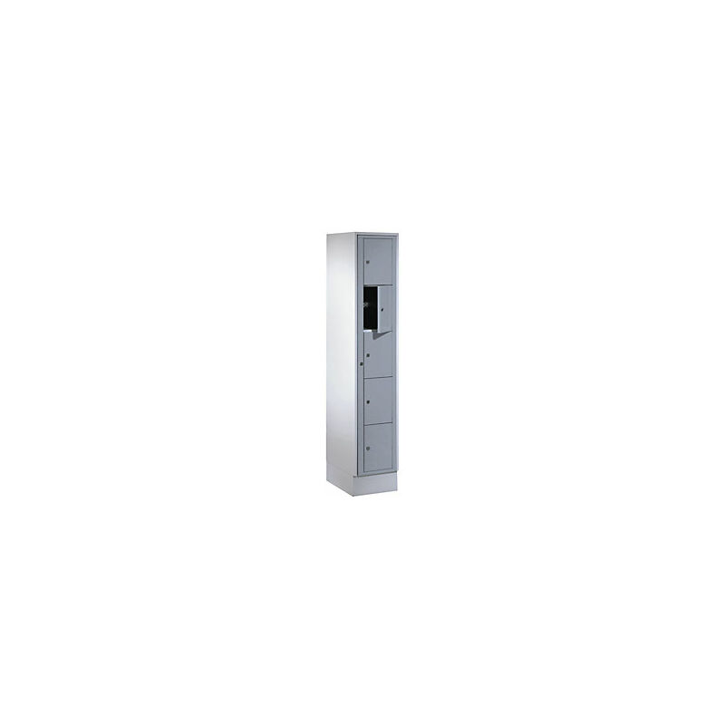 Armadietto per biancheria, alt. x largh. x prof. 1800 x 350 x 500 mm, 5 scomparti, grigio chiaro / grigio argento. Fornitura = montato. Altezza = 1800 mm. Profondità = 500 mm. Larghezza = 350 mm. Colore corpo = grigio chiaro RAL 7035. Colore porta = grigio argento RAL 7001. Serratura = serratura a cilindro differenziata. Numero scomparti in larghezza = 1 pz. Numero scomparti = 5 pz. Larghezza scomparti = 350 mm. Materiale = lamiera d'acciaio, con verniciatura a forno. Altezza armadietto = 1800 mm. Dotazione interna = senza accessori. Larghezza interna = 348 mm. Altezza interna = 330 mm. Profondità interna = 475 mm. Tipo di porta = anta a battente. Numero chiavi = 2 pz. Altezza scomparti = 330 mm. Larghezza ripiani = 350 mm. Profondità ripiani = 500 mm. Altezza zoccolo = 100 mm. Struttura = saldata. Superficie = con verniciatura a forno. Con cinque scomparti con serratura e anta centrale oltre i cinque scomparti. Grazie all'apertura centralizzata, è possibile aprire contemporaneamente