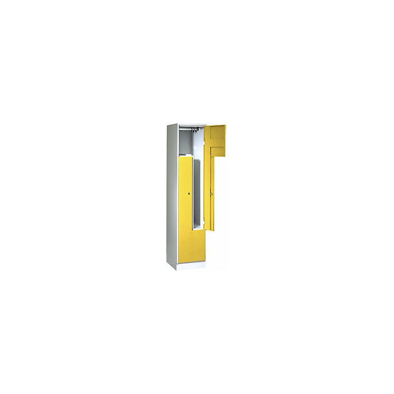 Armadietto guardaroba con ante a Z, 2 scomparti, ante giallo zinco. Fornitura = montato. Altezza = 1800 mm. Profondità = 500 mm. Larghezza = 400 mm. Colore corpo = grigio chiaro RAL 7035. Colore porta = giallo zinco RAL 1018. Serratura = serratura a cilindro di sicurezza differenziata. Numero scomparti in larghezza = 2 pz. Numero scomparti = 2 pz. Larghezza scomparti = 200/400 mm. Materiale = lamiera d'acciaio saldata. Altezza armadietto = 1800 mm. Dotazione interna = 1 asta appendiabiti, 3 ganci scorrevoli. Larghezza interna = 200 / 398 mm. Altezza interna = 398 / 1305 mm. Profondità interna = 475 mm. Tipo di porta = anta a battente. Numero chiavi = 2 pz. Profondità ripiani = 500 mm. Altezza zoccolo = 100 mm. Struttura = saldata. Superficie = con verniciatura a forno. Due armadietti guardaroba al posto di uno - più scompartimenti singoli in spogliatoio. Possibilità di appendere i vestiti lunghi. Aerazione mediante fori sulla parete posteriore. Serratura a cilindro di sicurezza