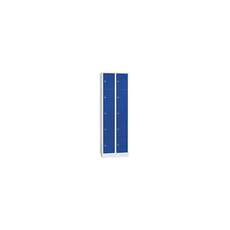 Armadio a scomparti modulari, 10 scomparti larghi 300 mm, blu genziana / grigio chiaro. Fornitura = in parte smontato. Altezza = 1850 mm. Profondità = 500 mm. Larghezza = 600 mm. Colore corpo = grigio chiaro RAL 7035. Colore porta = blu genziana RAL 5010. Serratura = serratura a cilindro differenziata. Numero scomparti in larghezza = 2 pz. Numero scomparti = 10 pz. Larghezza scomparti = 300 mm. Materiale = lamiera d'acciaio, saldata a punti. Altezza armadietto = 1850 mm. Dotazione interna = senza dotazione interna. Larghezza interna = 298 mm. Altezza interna = 345 mm. Profondità interna = 475 mm. Tipo di porta = porte chiuse. Numero chiavi = 2 pz. Altezza scomparti = 350 mm. Larghezza ripiani = 300 mm. Profondità ripiani = 500 mm. Altezza zoccolo = 100 mm. Struttura = saldata a punti. Superficie = con verniciatura a forno. Robusta struttura in lamiera d'acciaio verniciata a fuoco, con saldatura a punti. Bordi con doppia profilatura contro il pericolo di lesioni. Aerazione degli