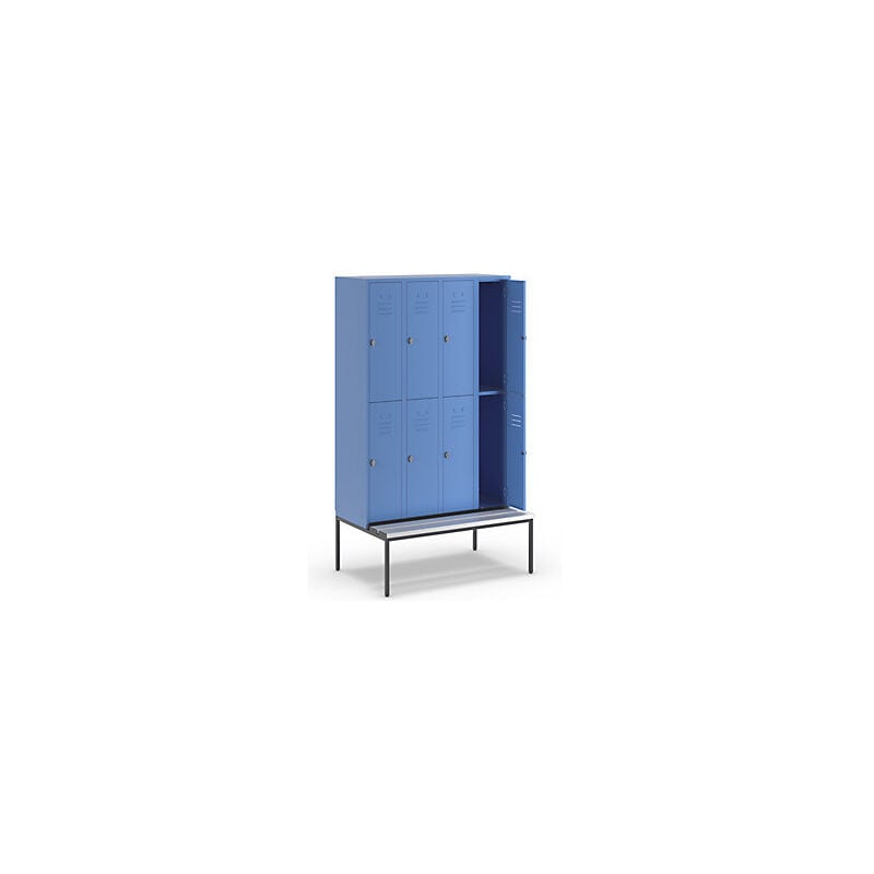 Armadietto guardaroba ad altezza ridotta con panca portante, 300 mm, 8 scomparti, parete piena, blu chiaro. Fornitura = montato. Altezza = 2140 mm. Larghezza = 1200 mm. Profondità = 800 mm. Colore corpo = blu chiaro RAL 5012. Colore porta = blu chiaro RAL 5012. Serratura = predisposizione per chiusura con lucchetto. Numero scomparti in larghezza = 4 pz. Numero scomparti = 8 pz. Materiale = lamiera d'acciaio, saldata a punti. Larghezza scomparti = 300 mm. Profondità scomparti = 500 mm. Dotazione interna = 1 asta appendiabiti, 3 ganci scorrevoli. Altezza sedile = 400 mm. Profondità sedile = 300 mm. Altezza zoccolo = 50 mm. Altezza armadio = 1750 mm. Profondità armadio = 500 mm. Tipo di porta = ante piene. Colore doghe = grigio. Colore telaio = grigio antracite RAL 7016. Serie = BERLIN. Larghezza interna = 298 mm. Altezza interna = 250 / 1420 mm. Robusta struttura in lamiera d'acciaio saldata a punti. Bordi con doppia profilatura contro il pericolo di lesioni. Ante con portatarghette
