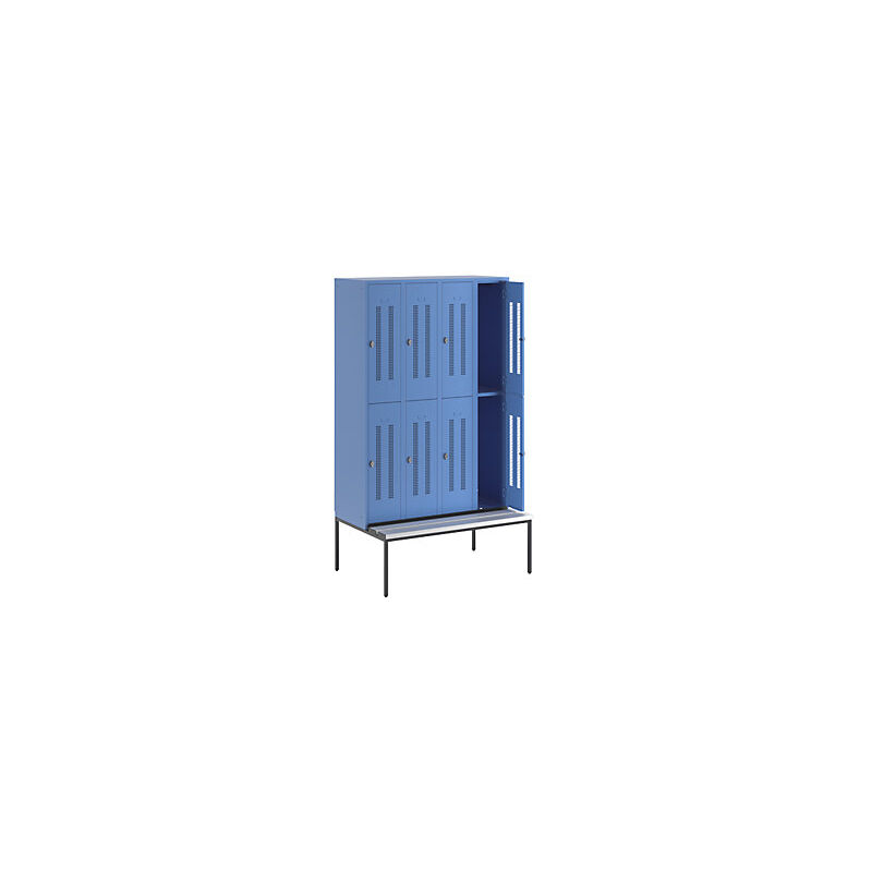 Armadietto guardaroba ad altezza ridotta con panca portante, 300 mm, 8 scomparti, lamiera forata, blu chiaro. Fornitura = montato. Altezza = 2140 mm. Larghezza = 1200 mm. Profondità = 800 mm. Colore corpo = blu chiaro RAL 5012. Colore porta = blu chiaro RAL 5012. Serratura = predisposizione per chiusura con lucchetto. Numero scomparti in larghezza = 4 pz. Numero scomparti = 8 pz. Materiale = lamiera d'acciaio, saldata a punti. Larghezza scomparti = 300 mm. Profondità scomparti = 500 mm. Dotazione interna = 1 asta appendiabiti, 3 ganci scorrevoli. Altezza sedile = 400 mm. Profondità sedile = 300 mm. Altezza zoccolo = 50 mm. Altezza armadio = 1750 mm. Profondità armadio = 500 mm. Tipo di porta = ante forate. Colore doghe = grigio. Colore telaio = grigio antracite RAL 7016. Serie = BERLIN. Larghezza interna = 298 mm. Altezza interna = 250 / 1420 mm. Robusta struttura in lamiera d'acciaio saldata a punti. Bordi con doppia profilatura contro il pericolo di lesioni. Ante con portatarghette