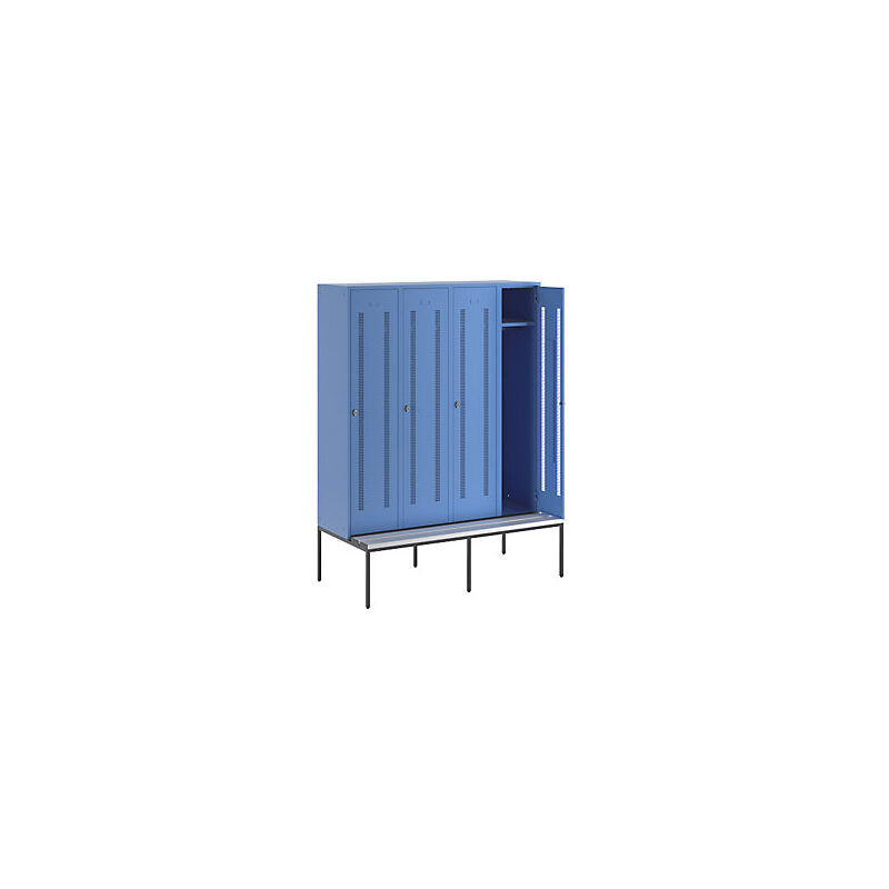 Armadietto guardaroba con panca inferiore integrata, ante in lamiera forata, larghezza scomparti 400 mm, 4 scomparti, blu chiaro. Fornitura = montato. Altezza = 2140 mm. Larghezza = 1600 mm. Profondità = 800 mm. Colore corpo = blu chiaro RAL 5012. Colore porta = blu chiaro RAL 5012. Serratura = chiavistello girevole. Numero scomparti in larghezza = 4 pz. Materiale = lamiera d'acciaio saldata. Larghezza scomparti = 400 mm. Profondità scomparti = 500 mm. Dotazione interna = 1 cappelliera, 1 asta appendiabiti con 4 ganci. Altezza sedile = 400 mm. Profondità sedile = 300 mm. Altezza armadio = 1750 mm. Profondità armadio = 500 mm. Tipo di porta = ante forate. Colore doghe = grigio. Colore telaio = nero notte RAL 9005. Serie = BERLIN. Larghezza interna = 398 mm. Altezza interna = 250 / 1420 mm. In robusta lamiera d'acciaio saldata, con rinforzo. Con panca portante. Chiavistello girevole predisposto per lucchetto (diametro staffa 6 - 8 mm max). Doghe in profilati alveolari in WPC di qualità