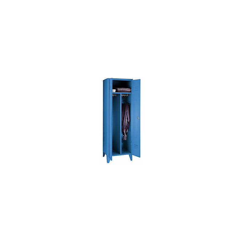 Armadietto in acciaio con piedini, scomparti a tutta altezza, ante piene, larghezza scomparto 600 mm, 1 scomparto, blu chiaro. Fornitura = montato. Altezza = 1850 mm. Profondità = 500 mm. Larghezza = 600 mm. Colore corpo = blu chiaro RAL 5012. Colore porta = blu chiaro RAL 5012. Serratura = chiavistello girevole. Numero scomparti in larghezza = 1 pz. Larghezza scomparti = 600 mm. Materiale = lamiera d'acciaio. Altezza armadietto = 1850 mm. Dotazione interna = 1 cappelliera, 1 asta appendiabiti, 6 ganci scorrevoli, parete divisoria centrale fissa. Larghezza interna = 598 mm. Altezza interna = 300 / 1400 mm. Profondità interna = 475 mm. Tipo di porta = ante piene. Altezza piedini = 150 mm. Struttura = saldata. Superficie = con verniciatura a forno. Robusto armadietto con piedini a norma DIN 4547. Disponibili in varie larghezze e colori. A scelta con ante forate o piene con battuta a destra. Dotazione interna personalizzabile. Fessure di aerazione per una circolazione ottimale dell'aria.