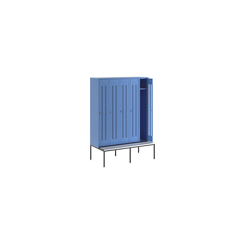 Armadietto guardaroba con panca inferiore integrata, ante in lamiera forata, larghezza scomparti 300 mm, 5 scomparti, blu chiaro. Fornitura = montato. Altezza = 2140 mm. Larghezza = 1500 mm. Profondità = 800 mm. Colore corpo = blu chiaro RAL 5012. Colore porta = blu chiaro RAL 5012. Serratura = chiavistello girevole. Numero scomparti in larghezza = 5 pz. Materiale = lamiera d'acciaio saldata. Larghezza scomparti = 300 mm. Profondità scomparti = 500 mm. Dotazione interna = 1 cappelliera, 1 asta appendiabiti con 3 ganci. Altezza sedile = 400 mm. Profondità sedile = 300 mm. Altezza armadio = 1750 mm. Profondità armadio = 500 mm. Tipo di porta = ante forate. Colore doghe = grigio. Colore telaio = nero notte RAL 9005. Serie = BERLIN. Larghezza interna = 298 mm. Altezza interna = 250 / 1420 mm. In robusta lamiera d'acciaio saldata, con rinforzo. Con panca portante. Chiavistello girevole predisposto per lucchetto (diametro staffa 6 - 8 mm max). Doghe in profilati alveolari in WPC di qualità