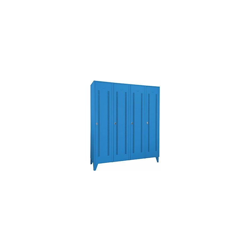 Armadietto in acciaio con piedini, scomparti a tutta altezza, ante forate, larghezza scomparto 400 mm, 4 scomparti, blu chiaro. Fornitura = montato. Altezza = 1850 mm. Profondità = 500 mm. Larghezza = 1600 mm. Colore corpo = blu chiaro RAL 5012. Colore porta = blu chiaro RAL 5012. Serratura = chiavistello girevole. Numero scomparti in larghezza = 4 pz. Larghezza scomparti = 400 mm. Materiale = lamiera d'acciaio. Altezza armadietto = 1850 mm. Dotazione interna = 1 cappelliera, 1 asta appendiabiti, 4 ganci scorrevoli. Larghezza interna = 398 mm. Altezza interna = 300 / 1400 mm. Profondità interna = 475 mm. Tipo di porta = ante forate. Altezza piedini = 150 mm. Struttura = saldata. Superficie = con verniciatura a forno. Robusto armadietto con piedini a norma DIN 4547. Disponibili in varie larghezze e colori. A scelta con ante forate o piene con battuta a destra. Dotazione interna personalizzabile. Fessure di aerazione per una circolazione ottimale dell'aria. Bordo con doppia profilatura