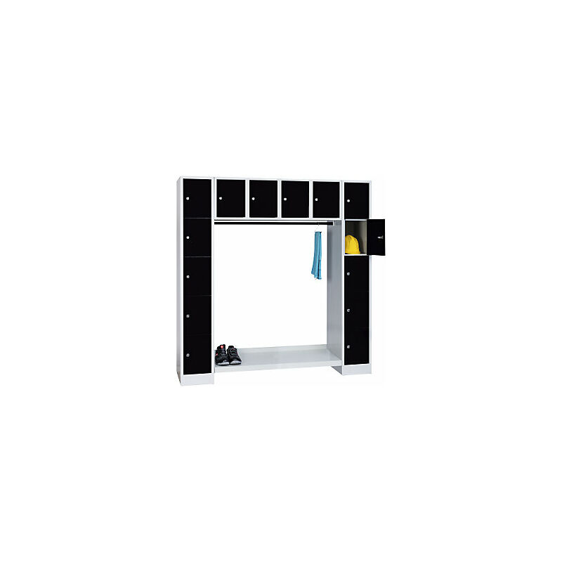 Appendiabiti a sistema modulare, aperto, alt. x largh. totale 1850 x 1800 mm, 14 scomparti, nero notte RAL 9005. Fornitura = in parte smontato. Altezza = 1850 mm. Profondità = 500 mm. Larghezza = 1800 mm. Colore corpo = grigio chiaro RAL 7035. Colore porta = nero notte RAL 9005. Serratura = serratura a cilindro differenziata. Numero scomparti in larghezza = 2 pz. Numero scomparti = 14 pz. Larghezza scomparti = 300 mm. Materiale = lamiera d'acciaio, saldata a punti. Altezza armadietto = 1850 mm. Dotazione interna = con scarpiera. Larghezza interna = 298 mm. Altezza interna = 345 mm. Profondità interna = 475 mm. Tipo di porta = porte chiuse. Numero chiavi = 2 pz. Altezza scomparti = 350 mm. Larghezza ripiani = 300 mm. Profondità ripiani = 500 mm. Altezza zoccolo = 100 mm. Struttura = saldata a punti. Superficie = con verniciatura a forno. Robusta struttura in lamiera d'acciaio verniciata a fuoco, con saldatura a punti. Bordi con doppia profilatura contro il pericolo di lesioni. Aerazione
