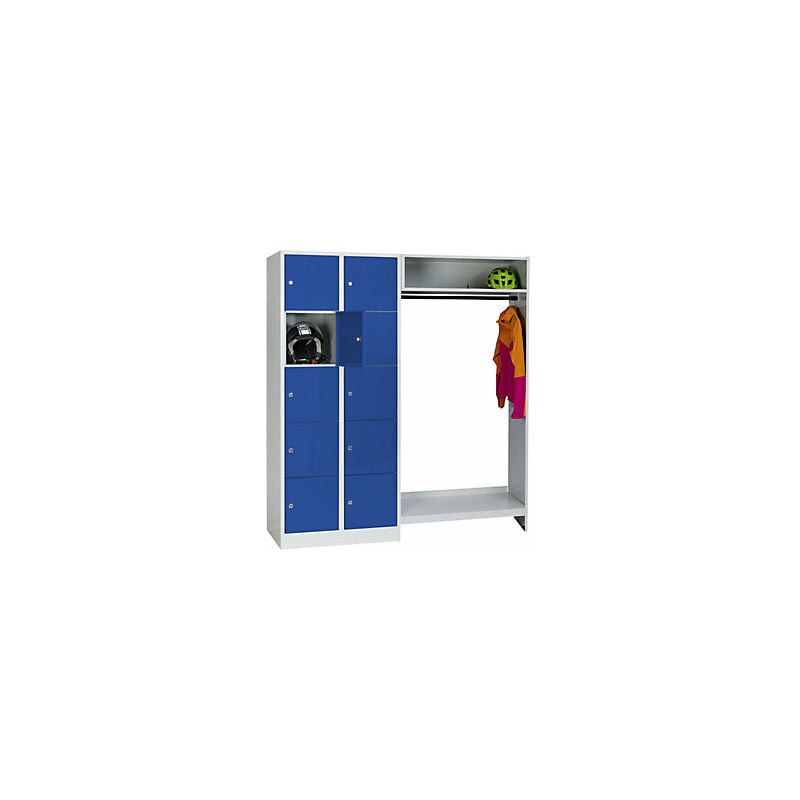 Sistema di strutture guardaroba con armadietti, 10 scomparti a sinistra, 10 grucce, larghezza totale 1670 mm, larghezza scomparti 398 mm, blu genziana / grigio chiaro. Fornitura = in parte smontato. Altezza = 1850 mm. Profondità = 500 mm. Larghezza = 1670 mm. Colore corpo = grigio chiaro RAL 7035. Colore porta = blu genziana RAL 5010. Serratura = serratura a cilindro differenziata. Numero scomparti in larghezza = 2 pz. Numero scomparti = 10 pz. Larghezza scomparti = 400 mm. Materiale = lamiera d'acciaio, con verniciatura a forno. Altezza armadietto = 1850 mm. Dotazione interna = senza dotazione interna. Larghezza interna = 398 mm. Altezza interna = 345 mm. Profondità interna = 475 mm. Tipo di porta = ante piene. Numero chiavi = 2 pz. Altezza scomparti = 350 mm. Larghezza ripiani = 400 mm. Profondità ripiani = 500 mm. Altezza zoccolo = 100 mm. Struttura = saldata. Superficie = con verniciatura a forno. Asta appendiabiti, a sezione ovale, con verniciatura plastica in nero. Portatarghette