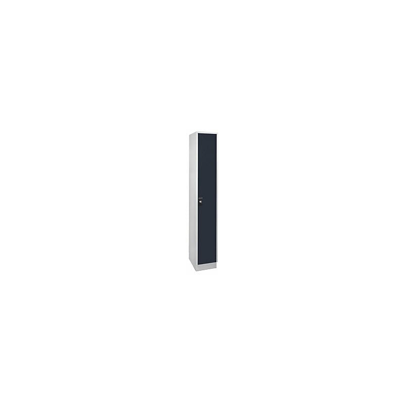 Armadietto guardaroba, 1 scomparto largo 300 mm, grigio chiaro / grigio antracite. Fornitura = montato. Altezza = 1800 mm. Profondità = 500 mm. Larghezza = 300 mm. Colore corpo = grigio chiaro RAL 7035. Colore porta = grigio antracite RAL 7016. Serratura = serratura a cilindro di sicurezza differenziata. Numero scomparti in larghezza = 1 pz. Larghezza scomparti = 300 mm. Materiale = lamiera d'acciaio. Altezza armadietto = 1800 mm. Dotazione interna = 1 ripiano per cappelli, 1 asta appendiabiti, 3 ganci. Larghezza interna = 298 mm. Altezza interna = 300/1400 mm. Profondità interna = 475 mm. Tipo di porta = frontalini lisci. Numero chiavi = 2 pz. Altezza zoccolo = 100 mm. Struttura = saldata. Superficie = con verniciatura a forno. Scomparti interni senza bordi per una facile pulizia. Aerazione mediante fori sulla parete posteriore. Fermi in gomma per una battuta ante silenziosa. Resistente struttura in lamiera d'acciaio con bordini di sicurezza ribattuti. Verniciatura a fuoco di qualità.