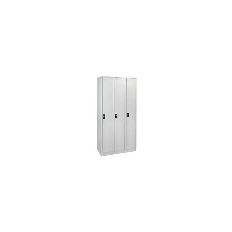 Armadietto guardaroba, 3 scomparti larghi 300 mm, grigio chiaro / grigio chiaro. Fornitura = montato. Altezza = 1800 mm. Profondità = 500 mm. Larghezza = 900 mm. Colore corpo = grigio chiaro RAL 7035. Colore porta = grigio chiaro RAL 7035. Serratura = serratura a cilindro di sicurezza differenziata. Numero scomparti in larghezza = 3 pz. Larghezza scomparti = 300 mm. Materiale = lamiera d'acciaio. Altezza armadietto = 1800 mm. Dotazione interna = 1 ripiano per cappelli, 1 asta appendiabiti, 3 ganci. Larghezza interna = 298 mm. Altezza interna = 300/1400 mm. Profondità interna = 475 mm. Tipo di porta = frontalini lisci. Numero chiavi = 2 pz. Altezza zoccolo = 100 mm. Struttura = saldata. Superficie = con verniciatura a forno. Scomparti interni senza bordi per una facile pulizia. Aerazione mediante fori sulla parete posteriore. Fermi in gomma per una battuta ante silenziosa. Resistente struttura in lamiera d'acciaio con bordini di sicurezza ribattuti. Verniciatura a fuoco di qualità.