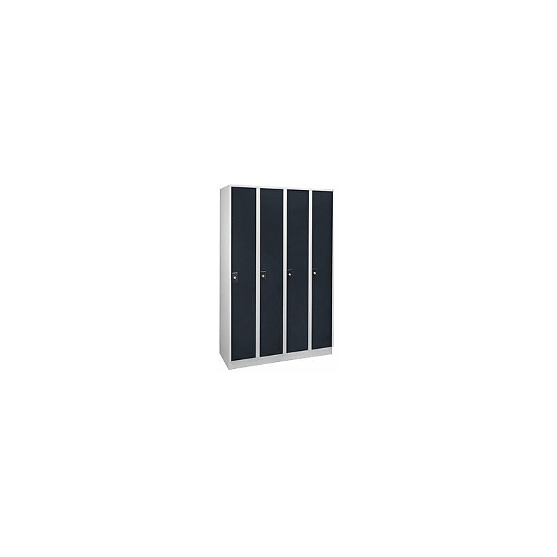 Armadietto guardaroba, 4 scomparti larghi 300 mm, grigio chiaro / grigio antracite. Fornitura = montato. Altezza = 1800 mm. Profondità = 500 mm. Larghezza = 1200 mm. Colore corpo = grigio chiaro RAL 7035. Colore porta = grigio antracite RAL 7016. Serratura = serratura a cilindro di sicurezza differenziata. Numero scomparti in larghezza = 4 pz. Larghezza scomparti = 300 mm. Materiale = lamiera d'acciaio. Altezza armadietto = 1800 mm. Dotazione interna = 1 ripiano per cappelli, 1 asta appendiabiti, 3 ganci. Larghezza interna = 298 mm. Altezza interna = 300/1400 mm. Profondità interna = 475 mm. Tipo di porta = frontalini lisci. Numero chiavi = 2 pz. Altezza zoccolo = 100 mm. Struttura = saldata. Superficie = con verniciatura a forno. Scomparti interni senza bordi per una facile pulizia. Aerazione mediante fori sulla parete posteriore. Fermi in gomma per una battuta ante silenziosa. Resistente struttura in lamiera d'acciaio con bordini di sicurezza ribattuti. Verniciatura a fuoco di
