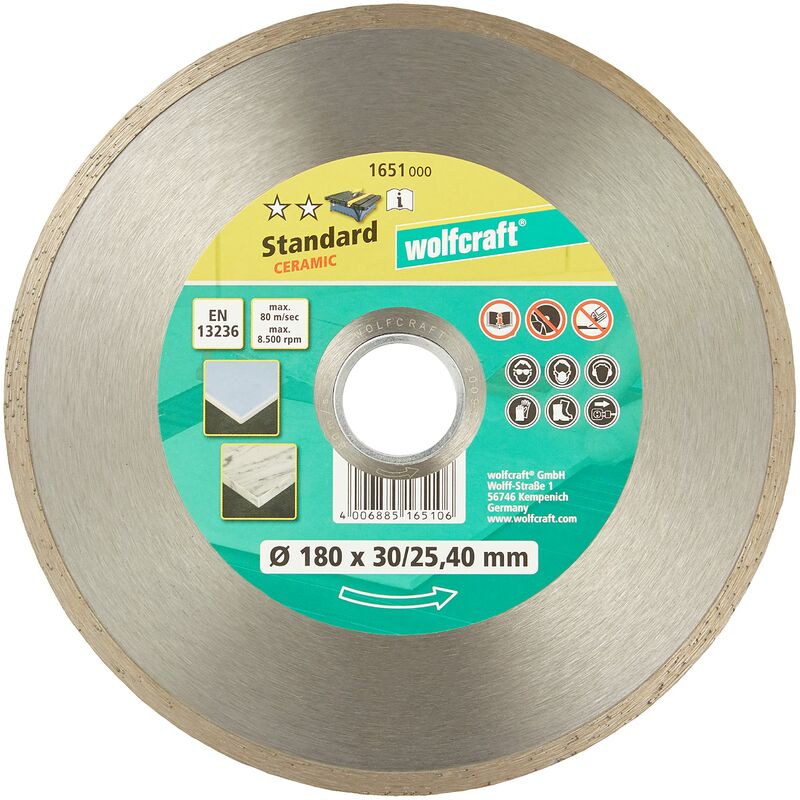 Descrizione 1 Disco da taglio diamantato Standard-Ceramic ø 180 mm - tagli puliti grazie alla corona continua - secondo la Norma EN 13236 - velocità di taglio: max. 80 m/sec - foratura di 30 mm con anello riduttore a 25,4 mm