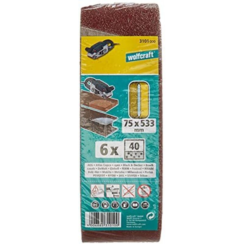 6 nastri di tela abrasiva - lunga durata - flessibile e resistente - materiale supporto: tessuto in cotone - indicato per aeg, atlas copco, black decker, bosch, casals, dewalt, einhell, ferm, festool, hitachi, holz-her, makita, metabo, milwaukee, perles, peugeot, ryobi, skil, stayer.