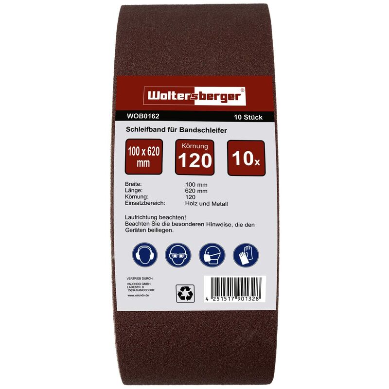 Nastri abrasivi robusti e durevoli di Woltersberger per la lavorazione del legno o del metallo. Specifiche tecniche: larghezza: 100 mm, lunghezza: 620 mm.