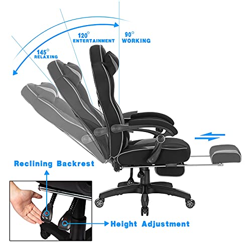 COMFORT PERSONALIZZABILE: Questa sedia da gaming è dotata di un pistone a gas classe 3, che consente di regolare l'altezza della seduta da 45 cm a 52 cm. Lo schienale ergonomico può essere regolato da 90 gradi a 145 gradi. Puoi sdraiarti e riposarti quando sei stanco dal lavoro o quando il gioco è in pausa. Il poggiapiedi può estendersi di 45 cm, alleviando efficacemente la pressione sulle gambe