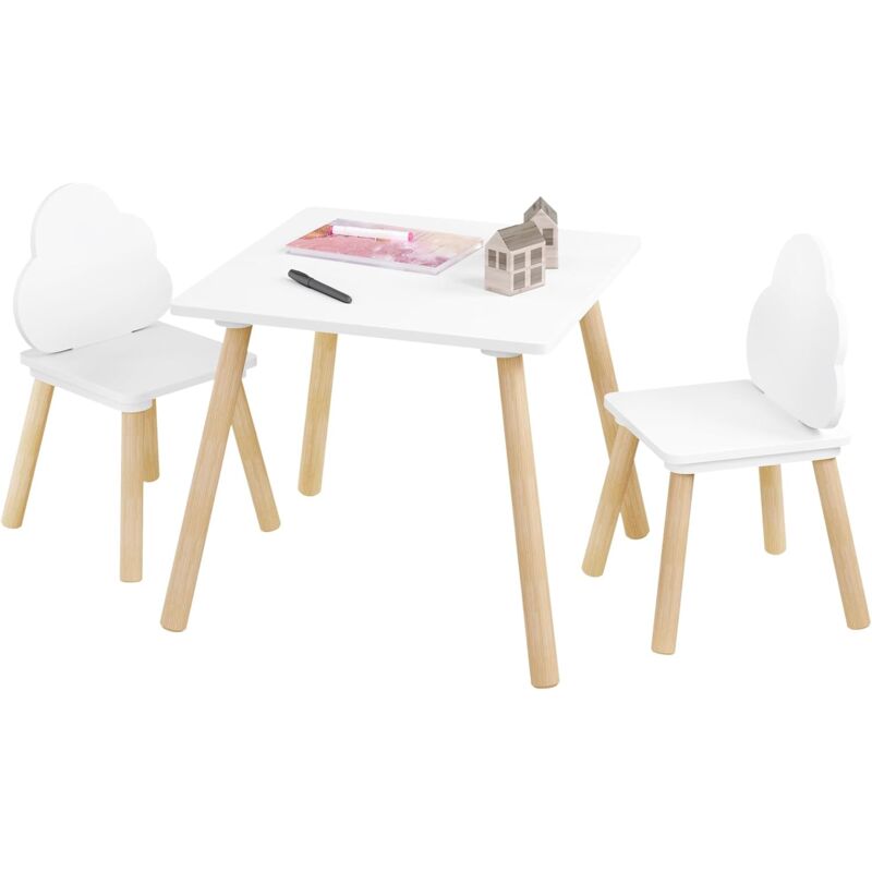 SET DA TAVOLO E SEDIE PER BAMBINI DA 3 PEZZI: 1 tavolo quadrato + 2 sedie con schienale a forma di nuvola. Il tavolo e le sedie Montessori per lo svezzamento dei bambini possono stimolare l'interesse del bambino ad utilizzarli, sviluppando la sua indipendenza nel mangiare e nell'apprendere, nonché la sua creatività nel disegnare, fare attività e creare oggetti di artigianato LA SICUREZZA È IMPORTANTE: progettato pensando alla sicurezza dei bambini, il set di tavolo e sedie per bambini è rifinito con angoli arrotondati per evitare lesioni dovute a urti accidentali. Inoltre, lo schienale fornisce un supporto alla schiena per aiutare a mantenere una postura corretta ROBUSTO E STABILE: il tavolo e le sedie per bambini sono realizzati in robusto MDF e supportati da gambe in legno massiccio strombate, per cui la struttura è stabile e non traballa durante l'uso. Il tavolo e ogni sedia possono sopportare rispettivamente 50 kg e 70 kg SALVASPAZIO: le 2 sedie per bambini possono essere riposte