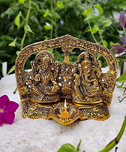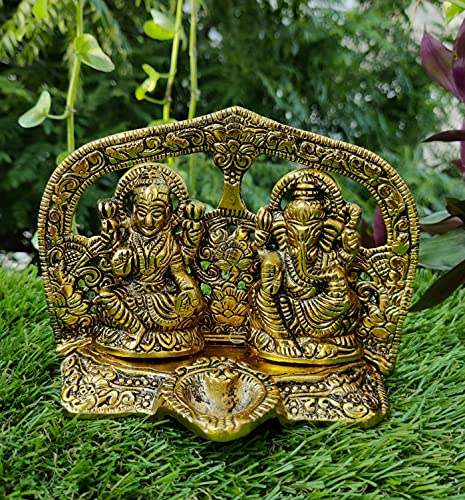 BELLISSIMO GANESH LAXMI CON DIYA: Questo idolo di Ganesh Laxmi ha un design dorato inciso su di esso. Questo ganesh laxmi ha anche un supporto diya di colore dorato.