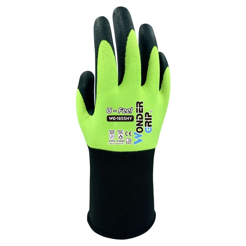 Il WG-1855HY U-Feel è dotato di una protezione per le mani in nitrile, su una base di poliestere e spandex a 18 fibre. Wonder Grip Performance offre una protezione sottile e lucida per sensibilità e sensibilità delle dita eccezionali