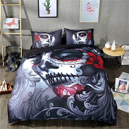 WONGS BEDDING Copripiumino di Cranio Tatuaggio Gotico Floreale Set di Copripiumino Biancheria da Letto in Microfibre Ipoallergenico Halloween 1 Copripiumino e 2 Federe Misura Doppia 200×200cm