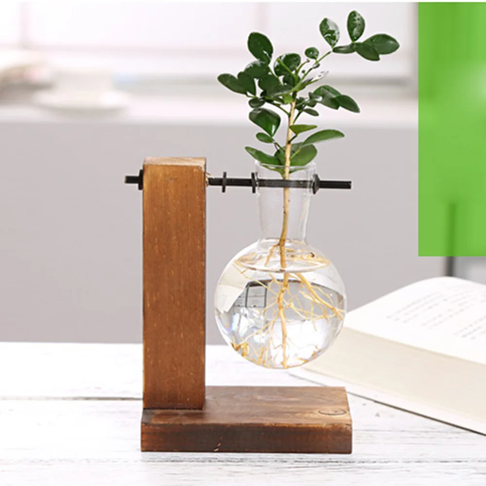 Wooden Art Hydroponics Container Transparent Glass Vase Modern Flower Plant Container Creative Terrarium Flowerpot for Room Home