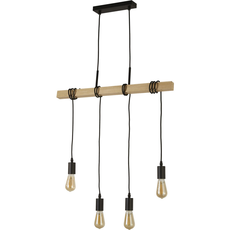 Collezione Legnoso STILE SENZA TEMPO La lampada a sospensione da soffitto Woody a 4 luci si fonde con gli stili di tendenza del fienile e dello stile industriale. La barra in legno discende da una plafoniera in metallo nero opaco, con 4 lampadine a vista che illuminano la stanza con uno stile contemporaneo.