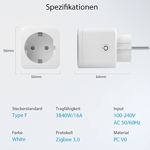 【NOTA】 Deve essere collegato al gateway Zigbee in modo da poterlo utilizzare, può essere Compatibile con Smarthings ZBBridge/Amazon Alexa/Samsung. La presa intelligente zigbee funziona anche con dispositivi hub intelligenti integrati come Amazon Echo 4th Gen/Echo Plus. il carico massimo della presa Smart Plug è 16 A, 3840 W, 5.6 × 5 × 4.4 cm.