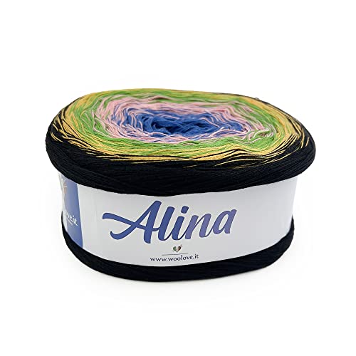 Alina è un filato di cotone misto acrilico. Un gomitolo denominato anche Yarn Cake proprio per la sua forma appiattita e i colori che si rincorrono per tutta la sua lunghezza ricordando una golosissima torta colorata.