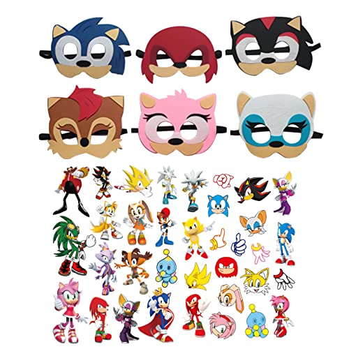 Wopin 6 Pezzi di Maschere soniche + 2 Fogli Adesivi Tatuaggi temporanei Impermeabili Finti sonici, Forniture per bomboniere a Tema Personaggi dei Cartoni Animati con Corda Elastica Costumi Maschere