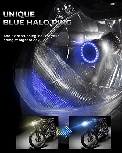 H4 LED con OCCHI ANGELO -- H4 LED faro moto sono dotati di occhio angelo blu, può utilizzare come DRL. Gli anelli di alone blu hanno un forte potere penetrante nei giorni piovosi e nebbiosi, riducendo la probabilità di pericolo. Anche occhio angelo è una decorazione fresca per la vostra moto, rende la vostra moto un aspetto unico.