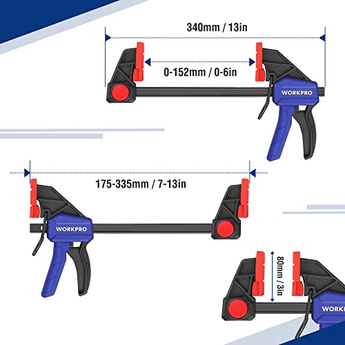 【Specifiche】WORKPRO morsetto da falegname pesa 560g, larghezza di serraggio 152mm, Intervallo di Allungamento 175mm-335mm, forza di serraggio massima 136kg. Fornisci un'assistenza efficace per i tuoi lavori di falegnameria