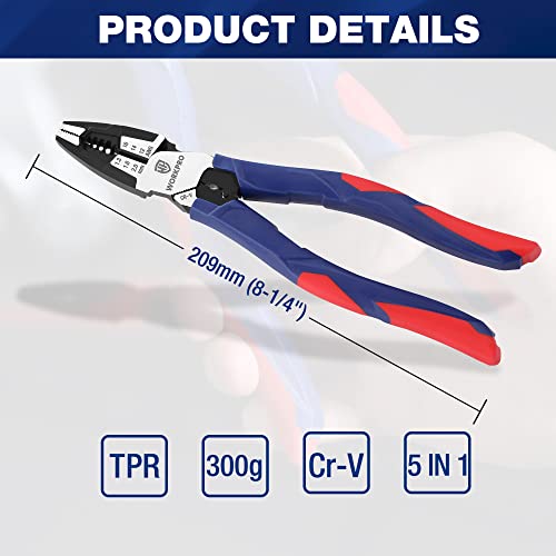 WORKPRO Pinza Combinata 5 in 1 con Spelafili/Crimpatrice/Taglierina/Chiave Inglese/Pinza Universale da 209mm per Filo da 16-12 AWG (1,3-2,0mm), Utensili Manuali Multiuso Cr-V per Elettricisti