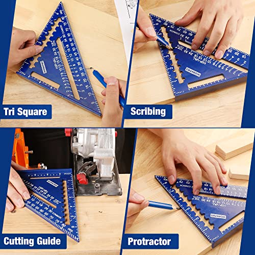 【Materiale durevole】La squadra da falegname è realizzata in lega di alluminio di alta qualità con una finitura blu per evitare i riflessi. Il righello è realizzato in acciaio inossidabile di alta qualità e la staffa angolare è in lega di zinco, il che garantisce che non si arrugginisca, non si deformi e non si rompa facilmente
