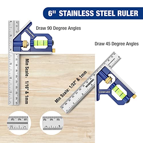 WORKPRO Squadra da Falegname Multifunzione 180mm e Squadra Combinata Regolabile 150mm, Righello Combinato con Bolla, Squadrette da Carpentieri in Acciaio Inossidabile per Fai da Te e Carpenteria