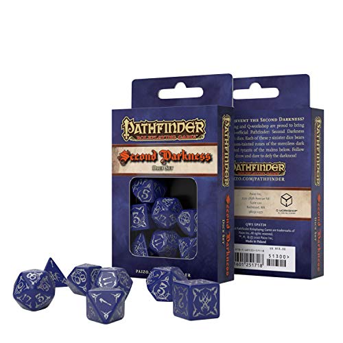 Q WORKSHOP presenta il set di dadi per la terza parte della serie Paizo Publishing "Pathfinder Chronicles: Second Darkness". I dadi nella nostra nuova combinazione di colori - viola e argento - riflettono vividamenta la natura subola degli Elfi Oscuri.