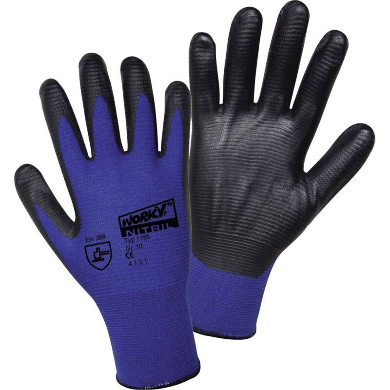 Guanti SUPER GRIP, blu / nero, conf. da 12 paia, taglia 9 (L). Fornitura = montato. Rivestimento = 100% nylon con rivestimento in nitrile. Taglia = 9. Colore = blu, nero. Norma = EN 420:2003+A1:2009 EN 388:2016. Utilizzo = magazzinaggio/logistica, edilizia, montaggio. Tipo di prodotto = guanti da meccanico/montaggio. Guanti in maglia fine estremamente antiscivolo per una presa sicura ottimale. Protezione contro l'umidità del sudore, antibatterici. Senza silicone. Guanti in maglia fine, 100% in nylon blu (calibro 13), lavorati sulla speciale macchina U3. Lo speciale rivestimento in nitrile nero super-grip protegge le mani dall'umidità del sudore e offre un'eccellente sicurezza antiscivolo. Presa sicura ottimale anche su superfici oleose e bagnate, ''smooth nitrile'' - superficie in nitrile liscia, particolarmente confortevoli da indossare, antibatterici. Ideali per lavori nell'industria automobilistica, con apparecchi domestici, durante la costruzione di macchinari e apparecchi, con