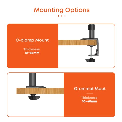 2 Opzioni di Montaggio - Questo support da doppio monitor per scrivanie fornite con un morsetto a C e un kit di montaggio passacavo. È possibile collegare il supporto dello schermo e tenere i due monitor con il morsetto a C (spessore massimo del tavolo8 cm). Se sulla scrivania è presente un foro, è possibile scegliere di montare l'anello di tenuta (spessore del tavolo massimo 4 cm).