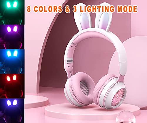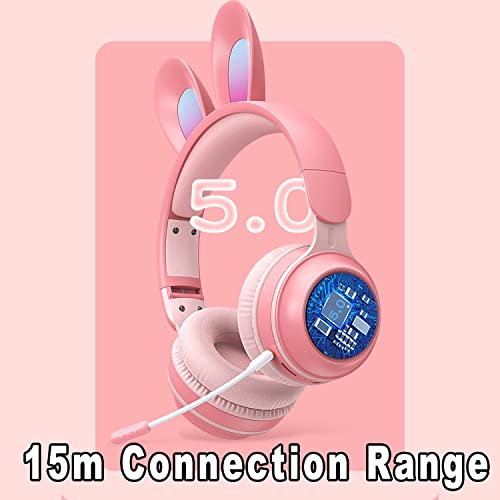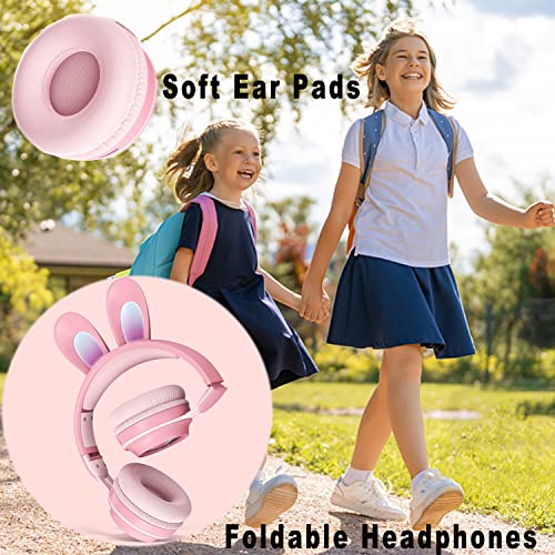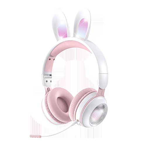 Woukksy Cuffie Bluetooth pieghevoli per ragazze senza fili con microfono con cancellazione del rumore e coniglio, orecchie LED, cuffie Over Ear per gaming/scuola/tablet/cellulare/PC (rosa)