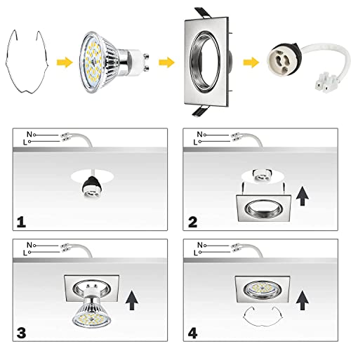 【6 Set LED GU10 con Cornice】 Accessori completi: 6 x lampadine GU10 + 6 x cornice quadrata nichel metallica+ portalampada GU10 + anello metallico = wowatt faretti da incasso a LED. È possibile cambiare i led GU10 e portafaretti.