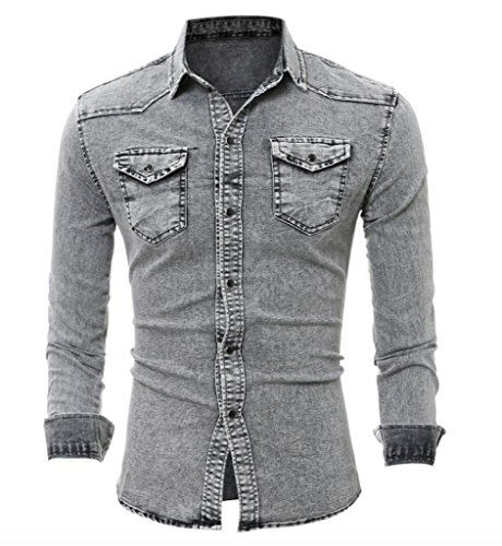 WSLCN Uomo Slim Fit Casual Camicia Slavata in Jeans a maniche lunghe