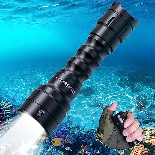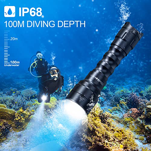 IP68 Waterproof LED Flashlight:As a professional diving flashlight with the highest IP68 waterproof rating and underwater depth up to 347m(1138FT). Con o-ring impermeabili e vetro temperato su due lati, può stere all'acqua fino a una profondità di 150 metri sott'acqua.
