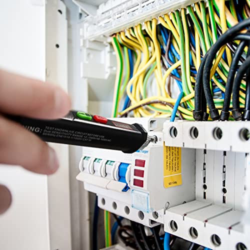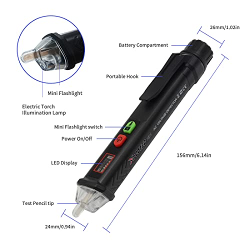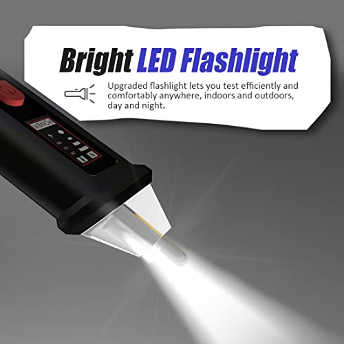 [Multifunzione e facile da usare] Rilevatore di tensione senza contatto con una torcia a LED che è conveniente per l'uso al buio, Continua a premere il pulsante verde per 2 secondi che può illuminare l'area di lavoro, puoi usarlo ovunque tu abbia bisogno al buio.
