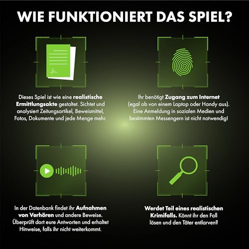 Giocatori 1-4+ - Il gioco Cold Cases Detectives è perfetto per i detective a partire dai 14 anni..2 - 3 ore di alta tensione - Importante: avete bisogno di accesso a Internet. La storia è giocabile solo una volta, ma il materiale non viene distrutto e quindi può essere regalato agli amici.