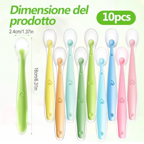 【10 Pezzi Cucchiai in Silicone】Il set di cucchiai per l'alimentazione del bambino ha 10 colori diversi, dimensioni: 6.3in*0.9in, capacità: 2.5ml. Può essere facilmente messo in una scatola per il pranzo per un facile pranzo fuori.