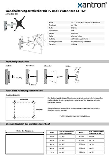 Xantron Supporto da Parete bloccabili per TV Monitor 13 - 42 vollbeweglich, allungabile, orientabile, inclinabile, Girevole, Eco 222
