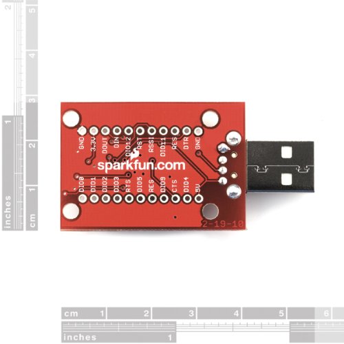 Questa è la SparkFun XBee Explorer Dongle Unit per il modulo Digi XBee. Con il dongle XBee Explorer si può collegare direttamente l'unità alla porta USB e ha un contatto diretto con il computer e l'XBee. Non sono necessari cavi.