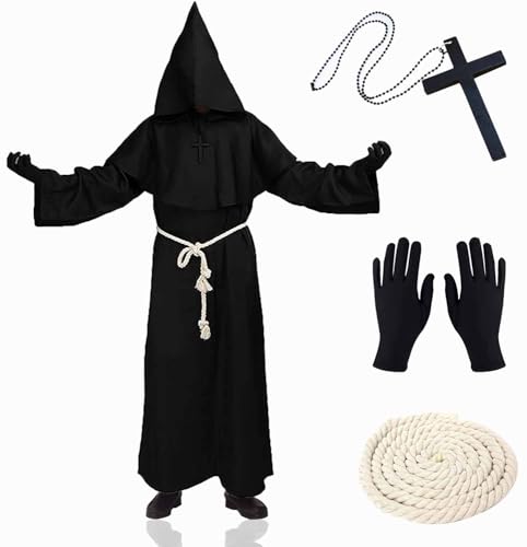 XCMVCN Costume da Monaco, Frate Medieval Rinascimentale Mantello con Cappuccio, Costumi da Prete Halloween Maschio, Halloween, Carnevale e Costumi da Gioco di Ruolo (Nero,XXL