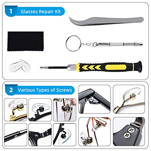Qualità premium: viti, dadi, pinzette e cacciavite sono realizzati in materiale composito di acciaio inossidabile di alta qualità, antiruggine e non si deforma facilmente. I naselli per occhiali sono realizzati in morbido silicone trasparente. Il panno per occhiali è realizzato in poliestere per pulire e pulire.