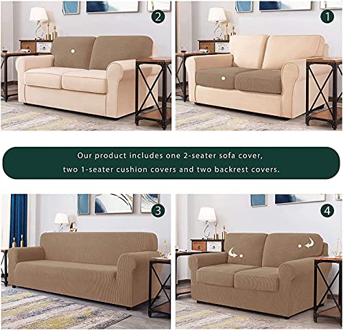 XDKS 7 Pezzi Copridivano Elasticizzato, Copridivano Con Tre Schienali Separati E Cuscini Con Fascia Elastica, Tessuto Jacquard Spandex A Quadri (Cammello,2 posti (145-178 cm))